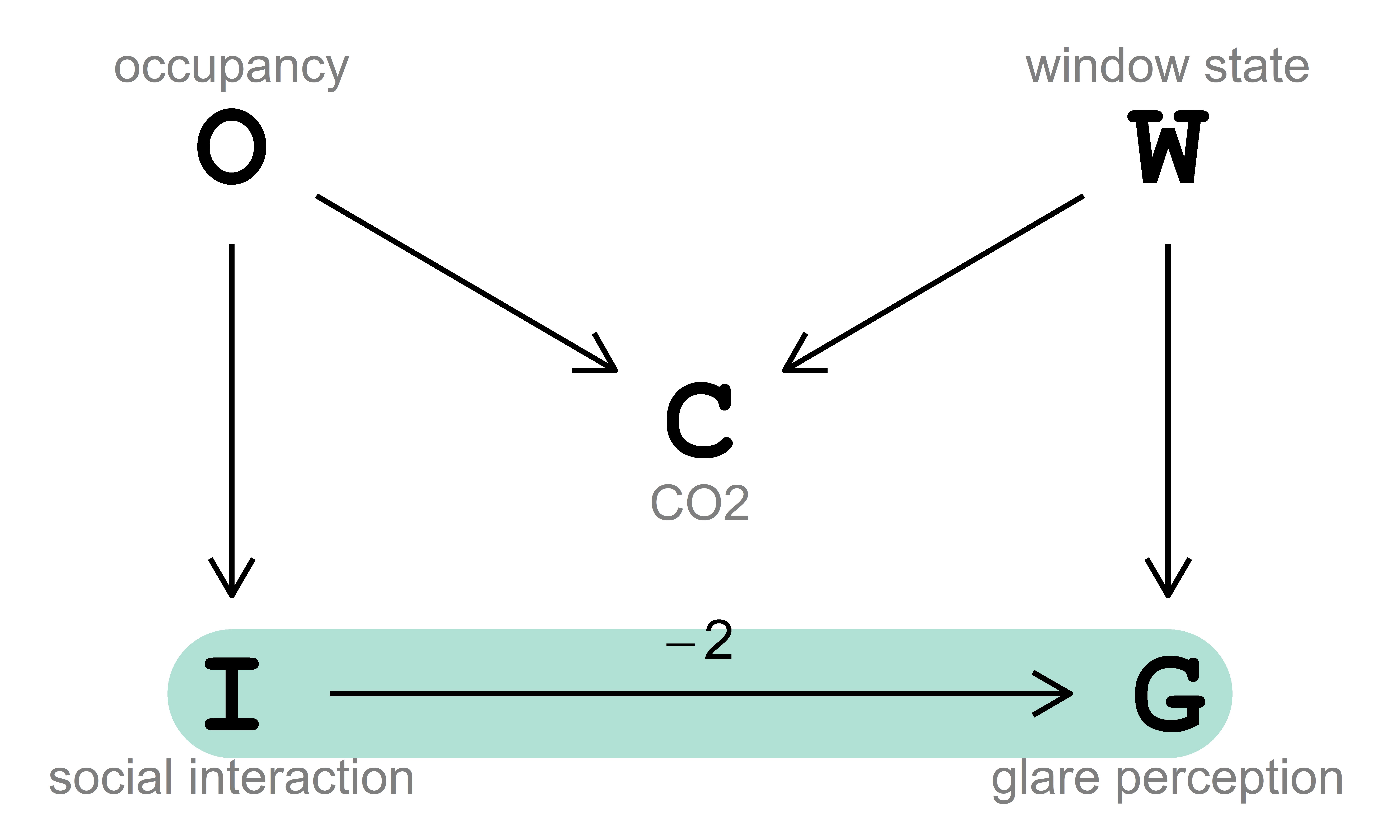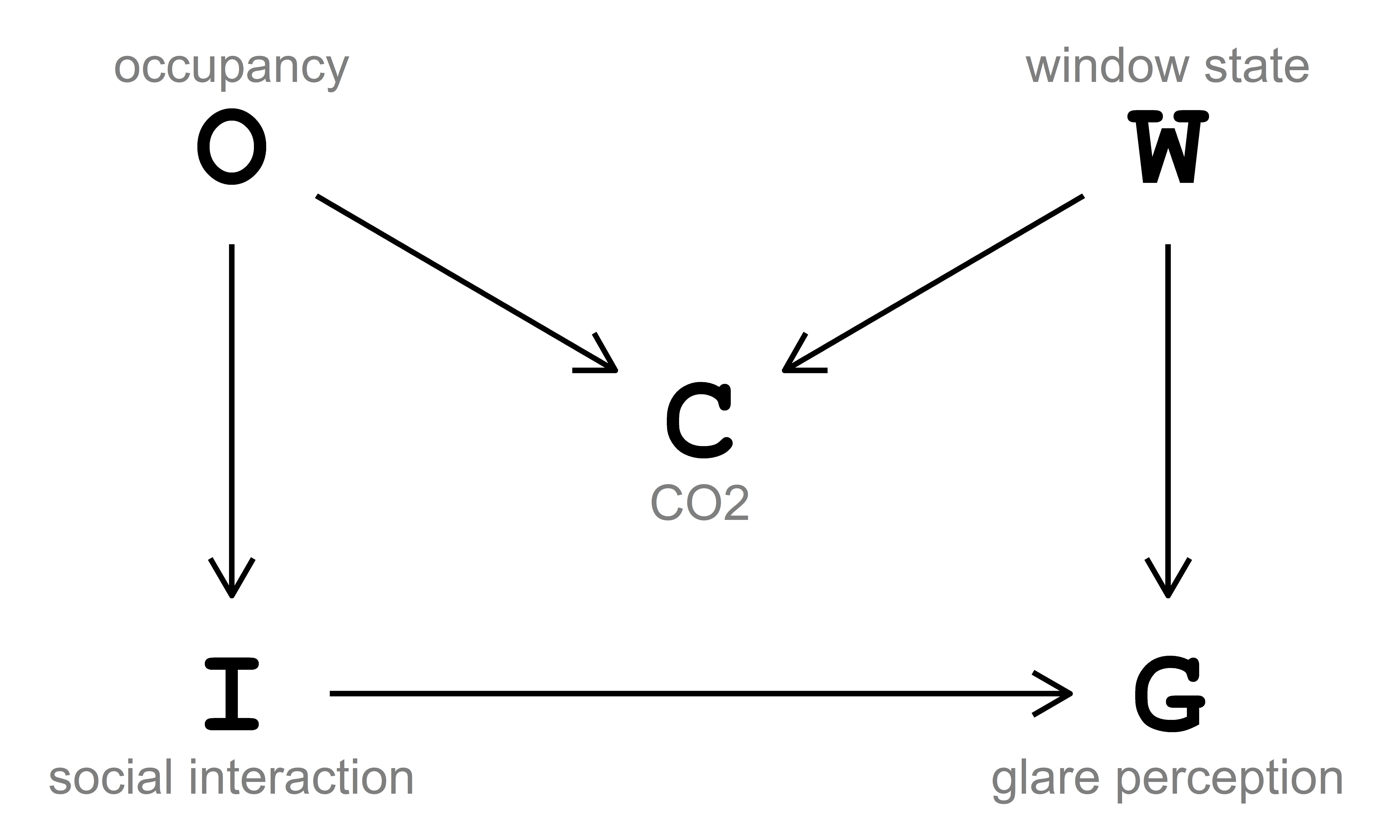 The data-generating process is described via the directed acyclic graph (DAG) in Fig. 2.1. In this DAG, glare perception \((\text{G})\) is directly influenced by social interaction \((\text{I})\) and window state \((\text{W})\), and indirectly by occupancy \((\text{O})\) through social interaction \((\text{I})\). Additionally, occupancy \((\text{O})\) and window state \((\text{W})\) directly influence CO2 concentration \((\text{C})\).