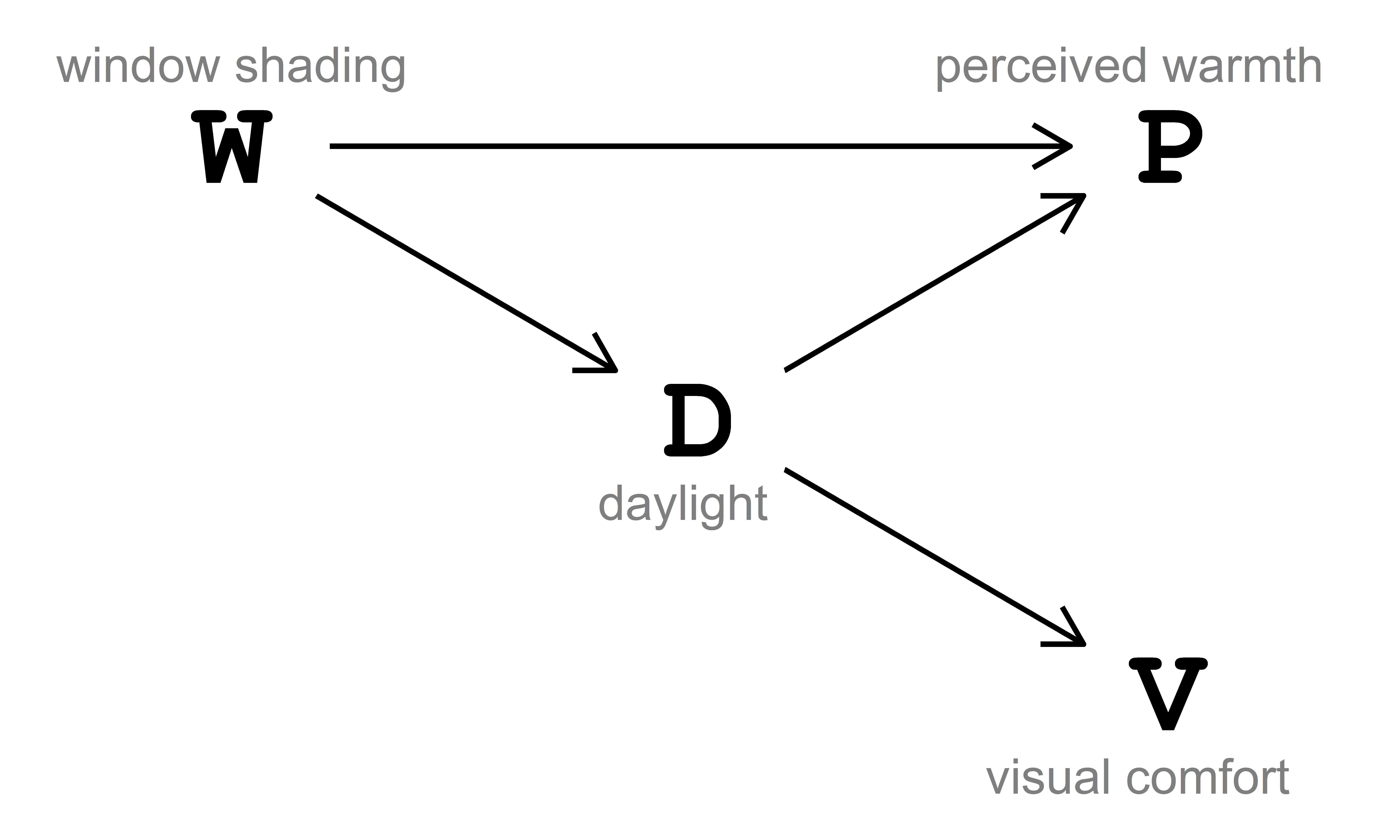 The data-generating process is described via the directed acyclic graph (DAG) in Fig. 3.1. In this DAG, window shading \((\text{W})\) influences perceived warmth \((\text{P})\) both directly and indirectly, passing through daylight \((\text{D})\). Additionally, window shading \((\text{W})\) also indirectly influences visual comfort \((\text{V})\) through daylight \((\text{D})\).
