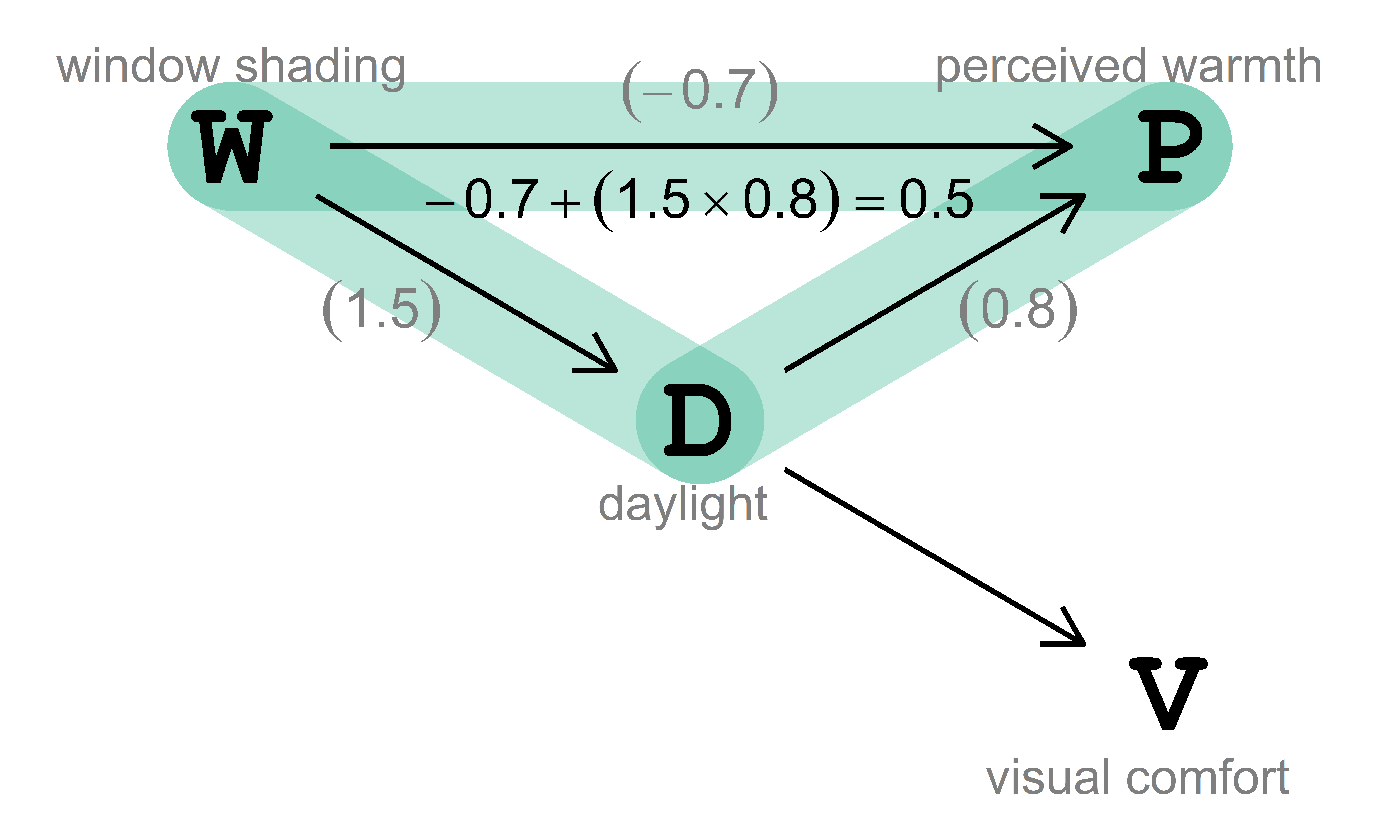 In this example, the target of our analysis is the total average causal effect, ACE (also known as total average treatment effect, ATE) of window shading \((\text{W})\) on perceived warmth \((\text{P})\), which stands for the expected increase of \(\text{P}\) in response to a unit increase in \(\text{W}\) due to an intervention. The causal effect of interest is visualized in Fig. 3.2.