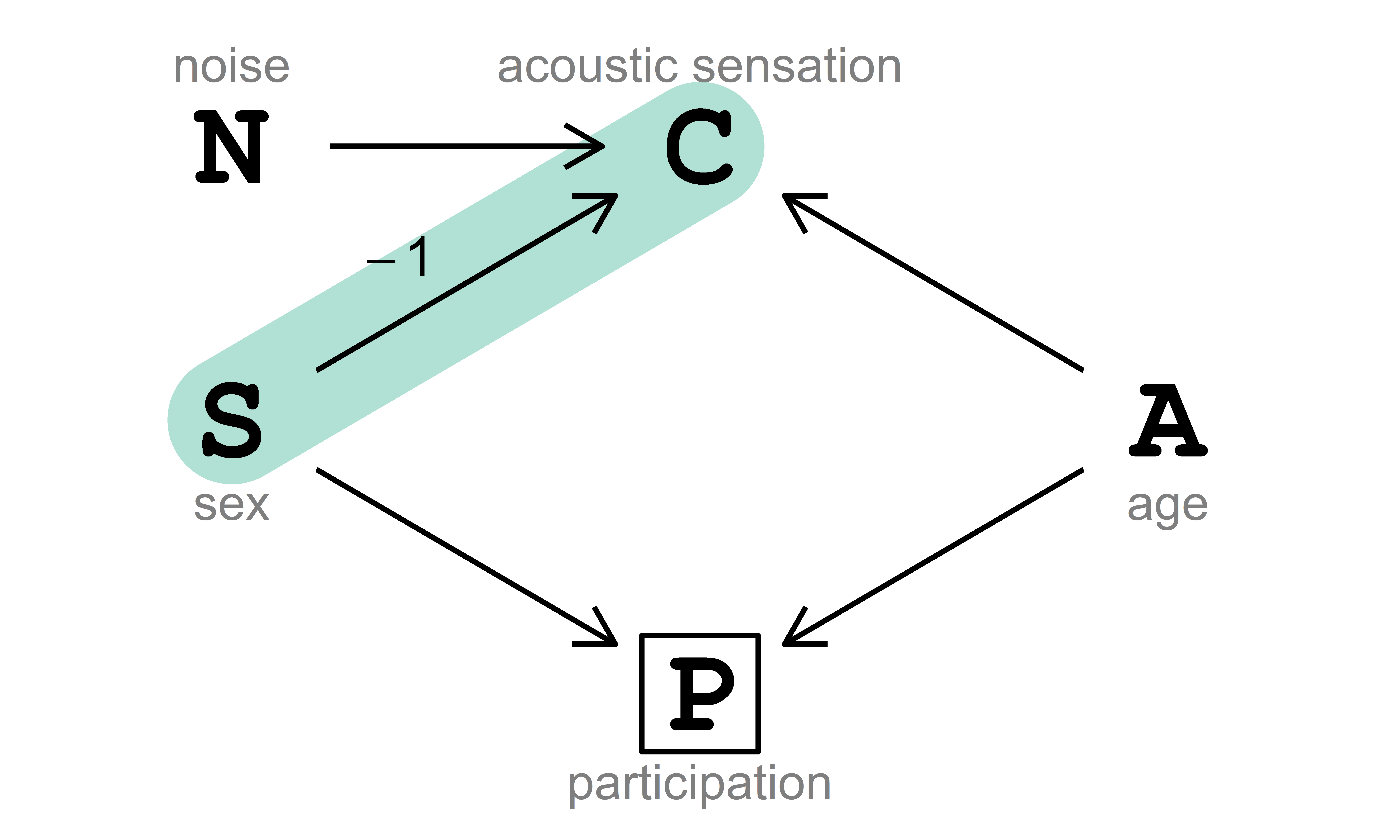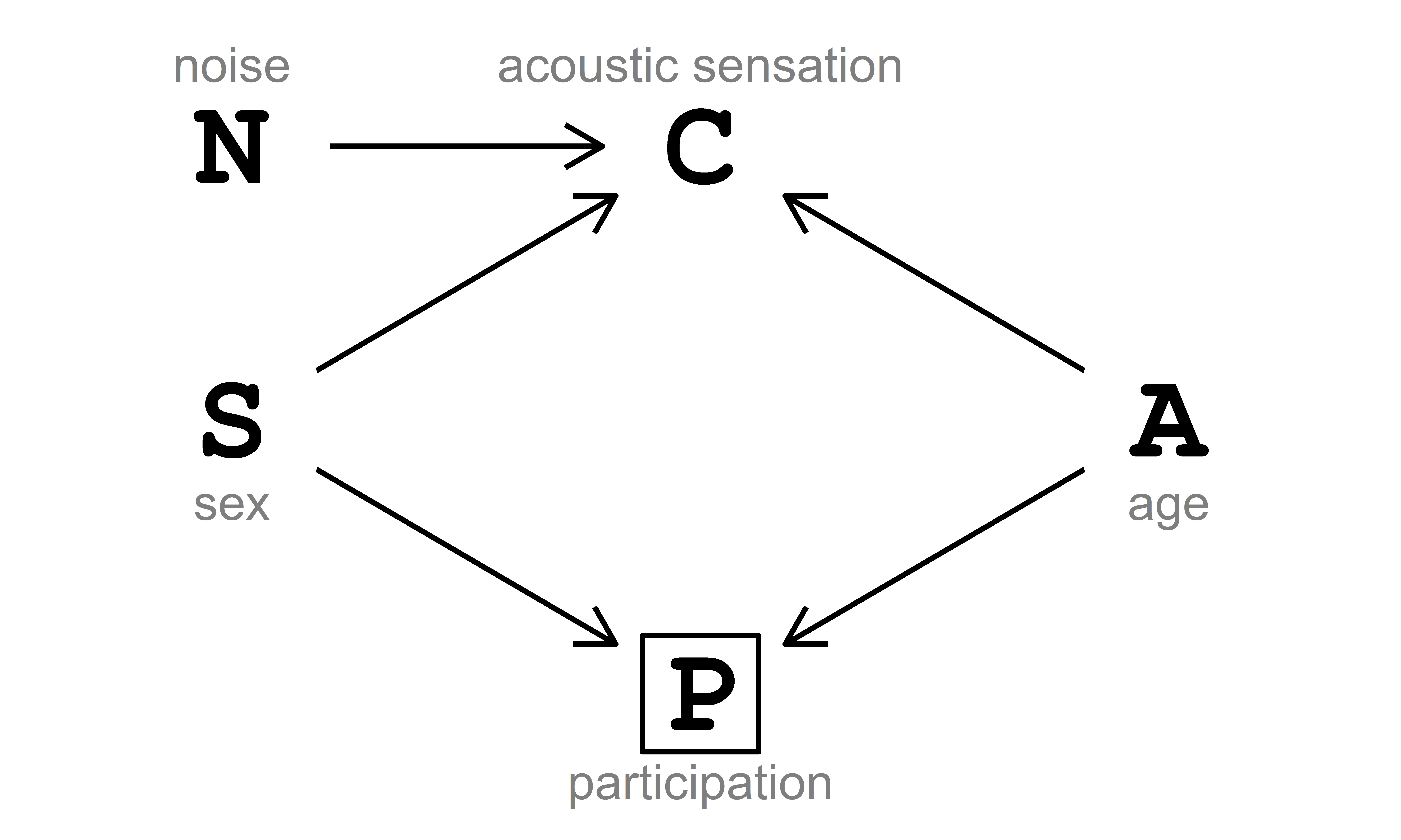 The data-generating process is described via the directed acyclic graph (DAG) in Fig. 5.1. In this DAG, acoustic sensation \((\text{C})\) is influenced directly by noise \((\text{N})\), biological sex \((\text{S})\) and age \((\text{A})\). Participation \((\text{P})\) in the survey response is affected by biological sex \((\text{S})\) and age \((\text{A})\).